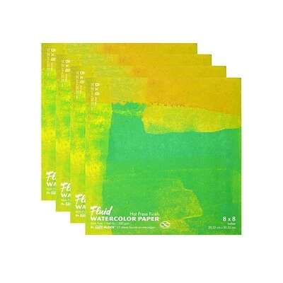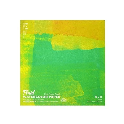 Fluid Hot Press Paper by Global Art offers a premium watercolor paper for artists at an affordable price. With the same demanding standards as Fluid Cold Press, Fluid Hot Press paper is acid-free and comprised of High Alpha Cellulose pulp. The Easy-Block is glued on two edges and allows artist to paint right on the paper block and easily remove the sheet when the paper is dry. These 140 lb. (300 gsm) offer a smooth absorbent surface for detailed painting. Sheets measure 8 in. x 8 in. and are sold as a pack of 4 blocks with 15 sheets per block.