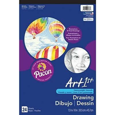Pacon® Art1st® Drawing paper pad measures 12″ x 18″ and is ideal for illustrations or final drawings. Pad includes 24 white colored 117 GSM sheets and is recyclable.