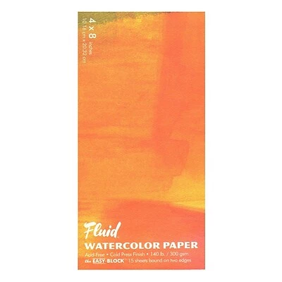 Fluid cold press watercolor paper is crafted in small batches at excessively slow speeds allowing for finer control of quality. This slow approach produces a sheet of great strength that shares much of the working integrity of more expensive mould-made papers.The Easy-Blocks are blocks of 15 sheets of watercolor paper that are glued along two edges, holding the paper flat as you paint. When your painting is dry, slide a dull knife or letter opener in the open side under the top sheet. Release the glue along one edge and pull your painting free! Available in 16 different size blocks as well as 6-sheet packs of 22 in. x 30 in. sheets.